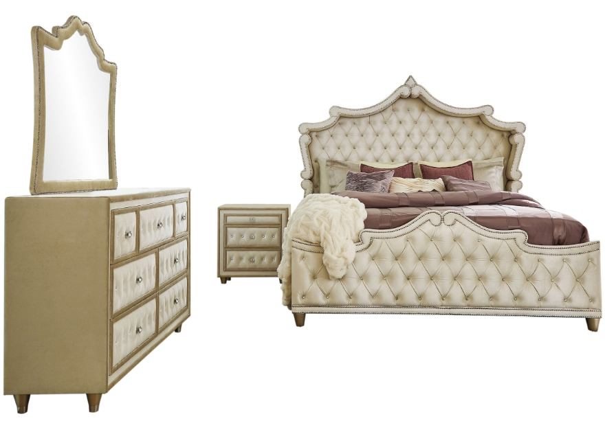 A traditional and modern bedroom set meets all expectations for an incredible impact in your sleeping space. Smooth and soft upholstered enhances each piece in this set. Coming in a camel and ivory color, this set is inspired by French Provincial decor. Crystal-like accents make their presence known within the button tufting.Read More
