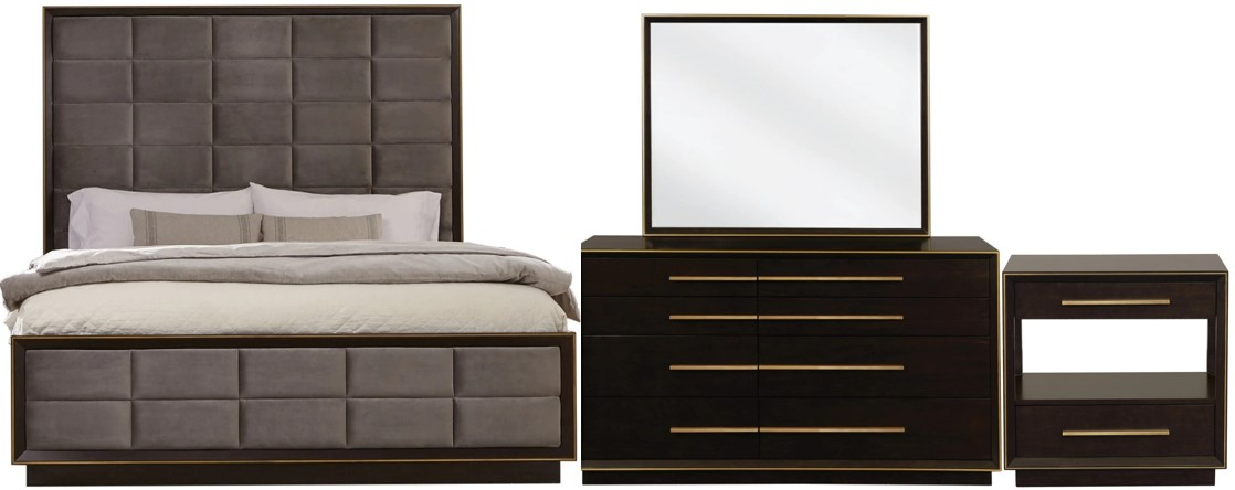Set Includes - Queen Upholstered Bed, Dresser, Mirror, and Nightstand