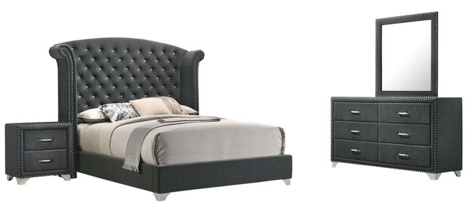 Bedroom set includes tufted bed and coordinating velvet-upholstered storage
