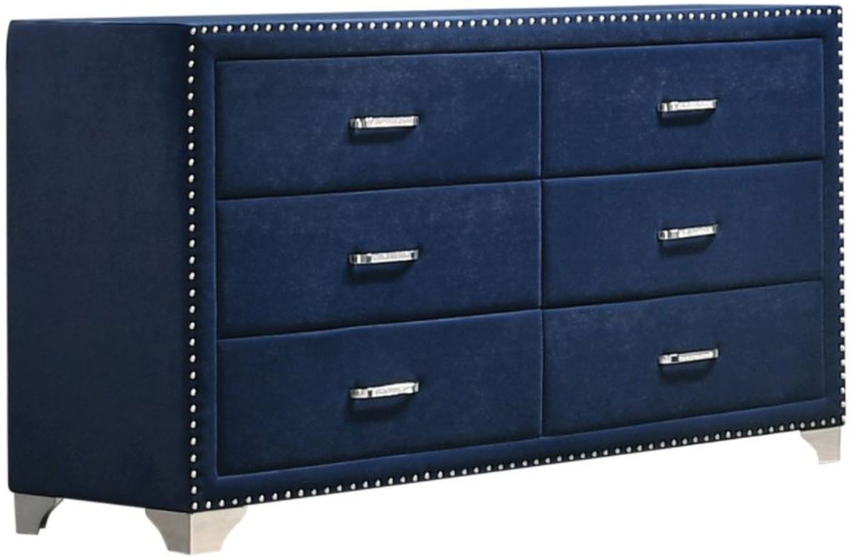 Give outdated sleeping spaces a facelift with this eye-popping and elegant dresser. Entirely upholstered in velvet, this dresser is a conversation starter. It is equipped with six spacious drawers to store your bedside items. Nail head trim makes a spectacular statement that matches the tapered legs. With its stunning and regal design, this dresser will transform your sleeping space into a royal retreat.