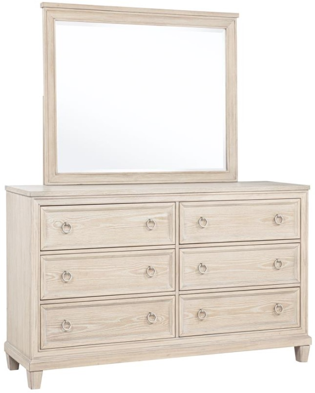Breezy and balanced, this dresser and mirror set captures the warmth of coastal mornings and the elegance of timeless design. Framed with stepped trim and polished nickel ring pulls, the six-drawer dresser offers generous storage wrapped in washed oak serenity.Read More