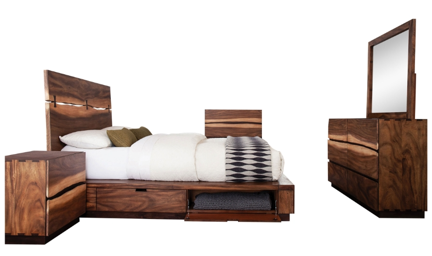 Bed includes a headboard with live edge detail and four built-in storage compartments