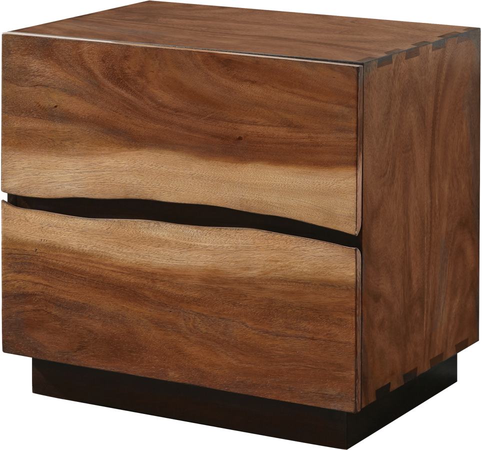 Update your personal space with the intriguing style of this wooden nightstand. Its frame sits atop a sturdy base with an attractive, dark finish. Its body and surface boast a striking smokey walnut and coffee bean finish. One edge of each drawer is crafted with an artsy, asymmetrical design and a cool, faded look, giving it a modern edge. This nightstand is an appealing blend of classic and contemporary styles.