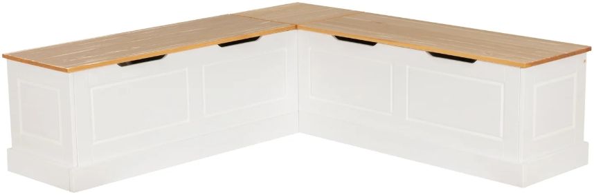 Made of solid pine, the bench tops feature a natural stain that highlights the woodgrain, while the white painted base lends a calming contrast. Lift-up seats reveal hidden storage—perfect for placemats, linens, or seasonal decor. The set ships in one box and includes a 5-piece cushion and pillow set. Solid beige seat cushions are matched with two 20” x 20” pillows in buffalo and small-scale plaids, plus an 18” x 12” striped lumbar pillow. All covers have zip closures for easy removal and cleaning. A perfect blend of comfort, charm, and convenience—this set creates a welcoming backdrop for the rhythms of everyday life.